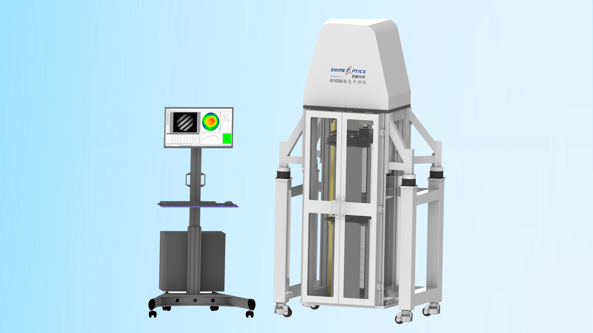 G100U和G150U是乾曜光學(xué)新開發(fā)的兩款正立式激光干涉儀工作站,有效口徑分別為101.6mm(4英寸)和152.4mm(6英寸)。可以測(cè)量平面面形、球面面形和曲率半徑,選配雙五維載物臺(tái),可以測(cè)量透過波前和非球面的補(bǔ)償法測(cè)量。