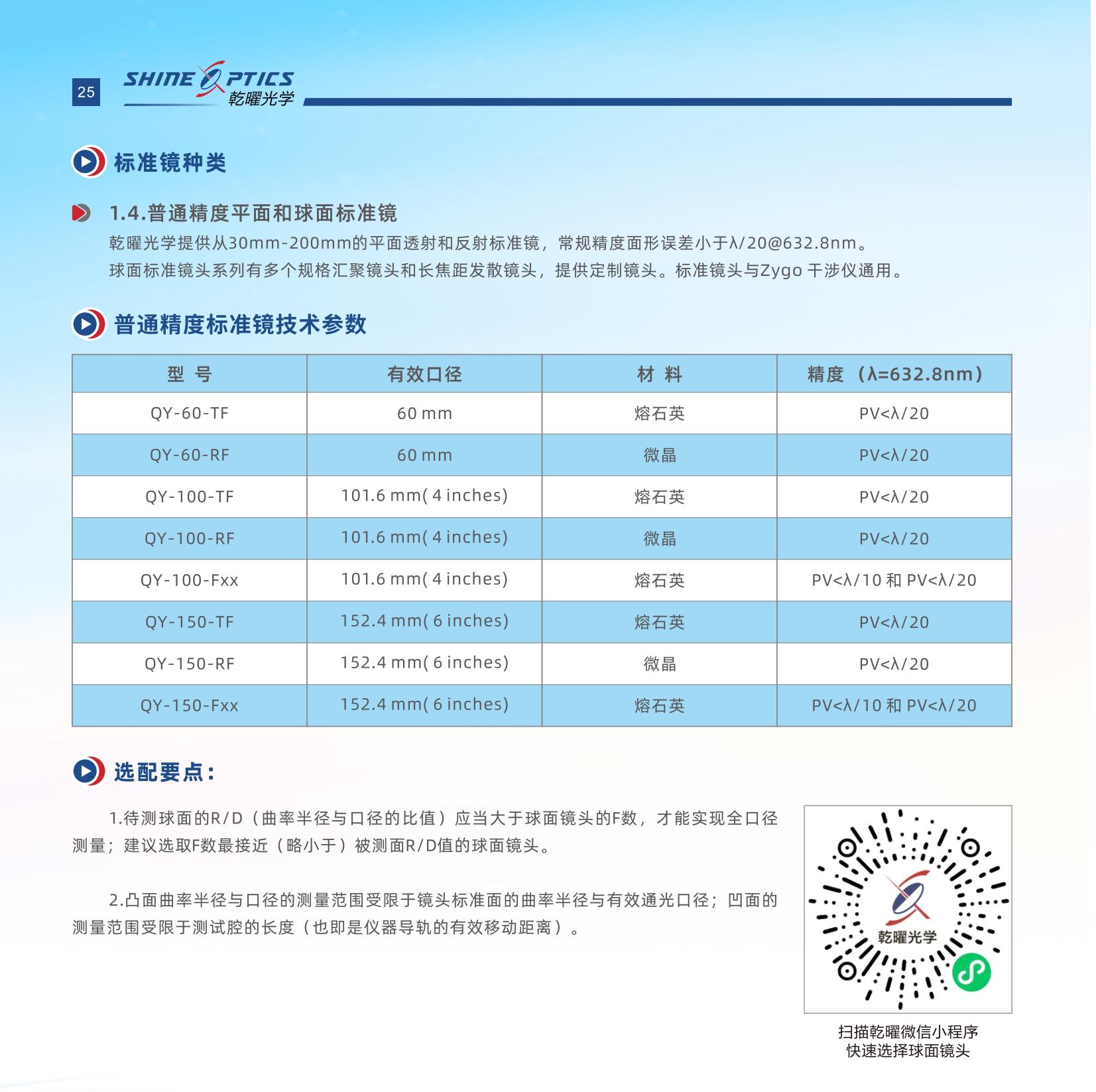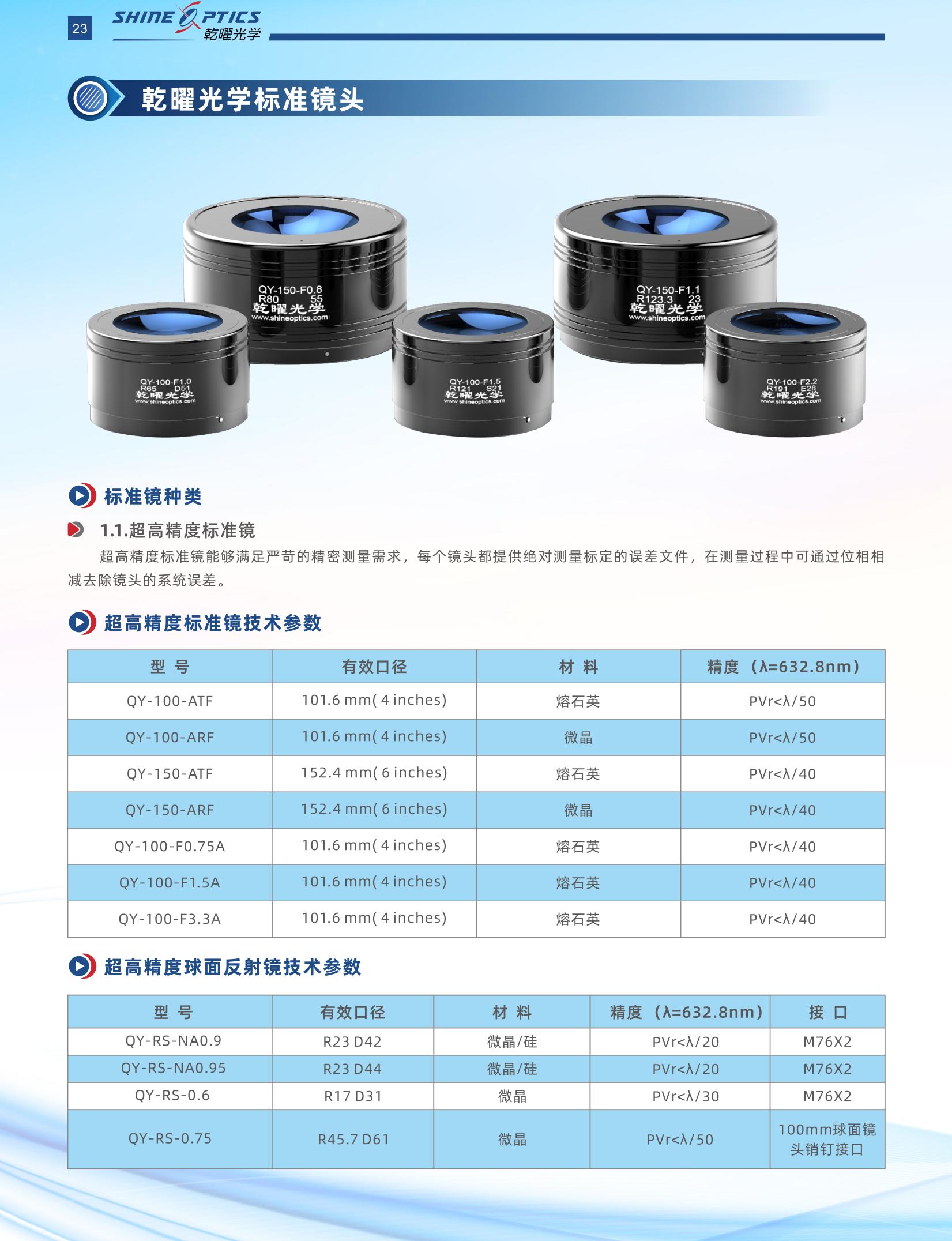 乾曜光學(xué)提供普通精度的球面標(biāo)準(zhǔn)鏡和超精密球面標(biāo)準(zhǔn)鏡,有效口徑有150mm (6英寸),100mm (4英寸), 60mm , 30mm„ 150mm和100mm口徑鏡頭與Zygo通用,60mm和30mm口徑鏡頭與富士通用。
